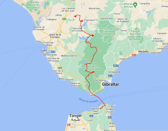 14.6.2024 Gyps africanus 1 ind Tráfico, PN El Estrecho, Tarifa, Cádiz (Simon Tonkin). Map: Track from the bird from Rachid (bird GA03 ringed in Morocco) with bird sleeping at Abrajanejo and leaving towards Jerez de la Frontera later.